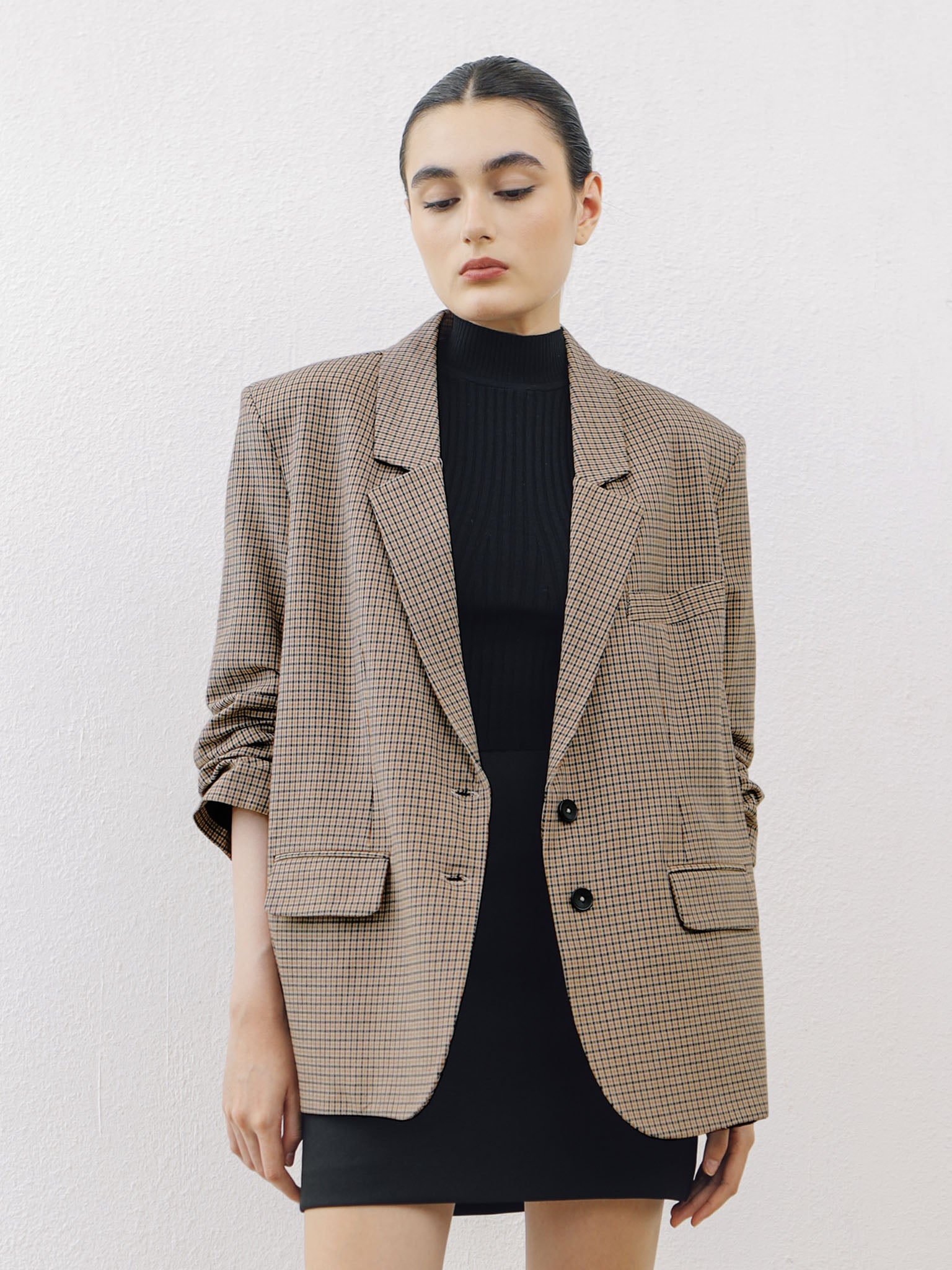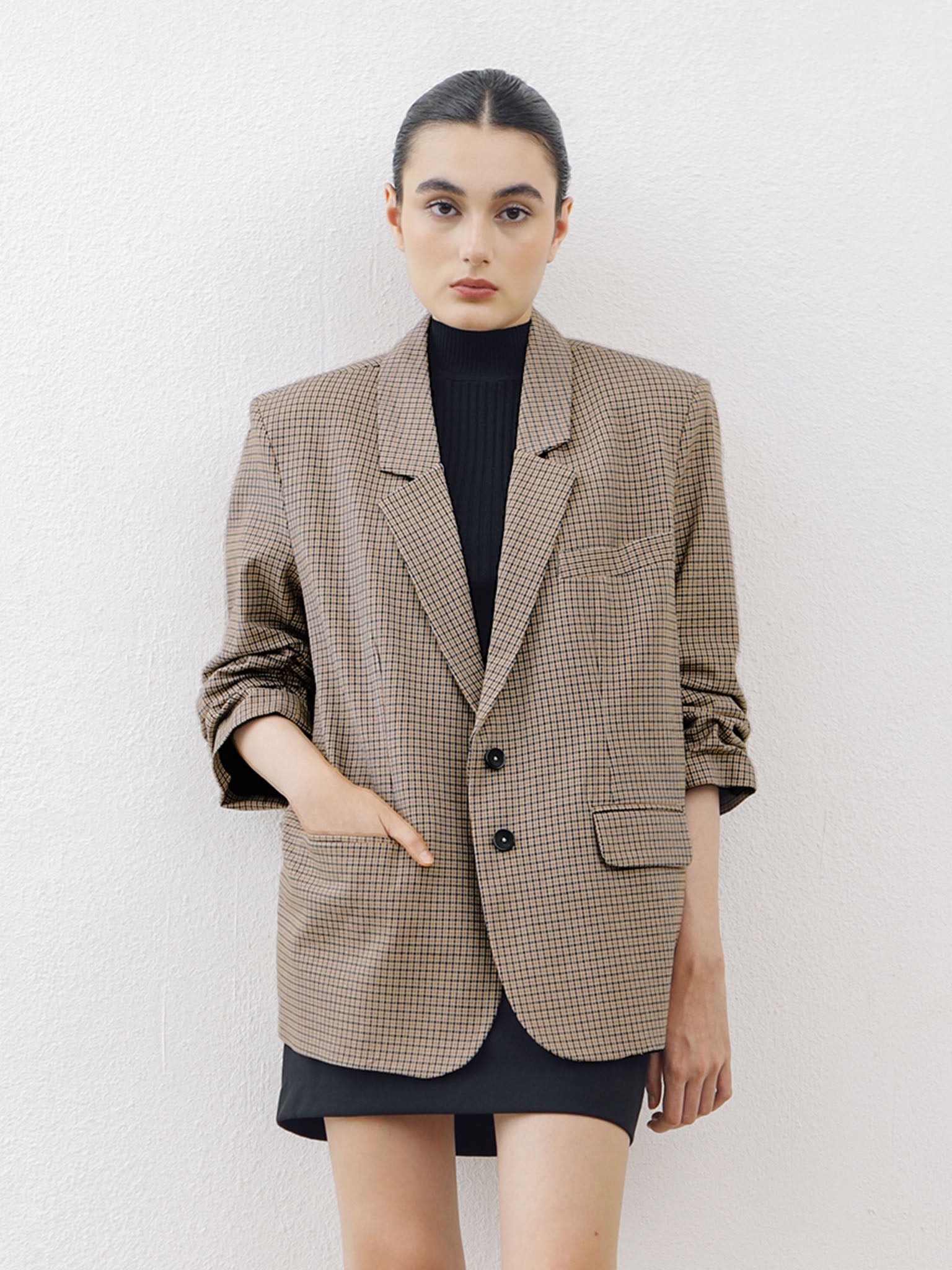 Material: semiwool with lining, permanent shoulder pads, 44 cm permanent creased sleeves